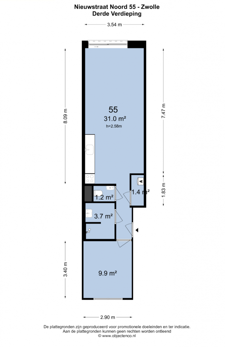 Het appartementen met huisnummer 55 is gelegen op de derde verdieping aan de Noordzijde van het complex. De oppervlakte is ongeveer 46m2. De woning beschikt over een woonkamer met open keuken, separaat toilet, badkamer en berging met wasmachine aansluiting. Daarnaast is er een extra onbenoemde ruimte aanwezig.