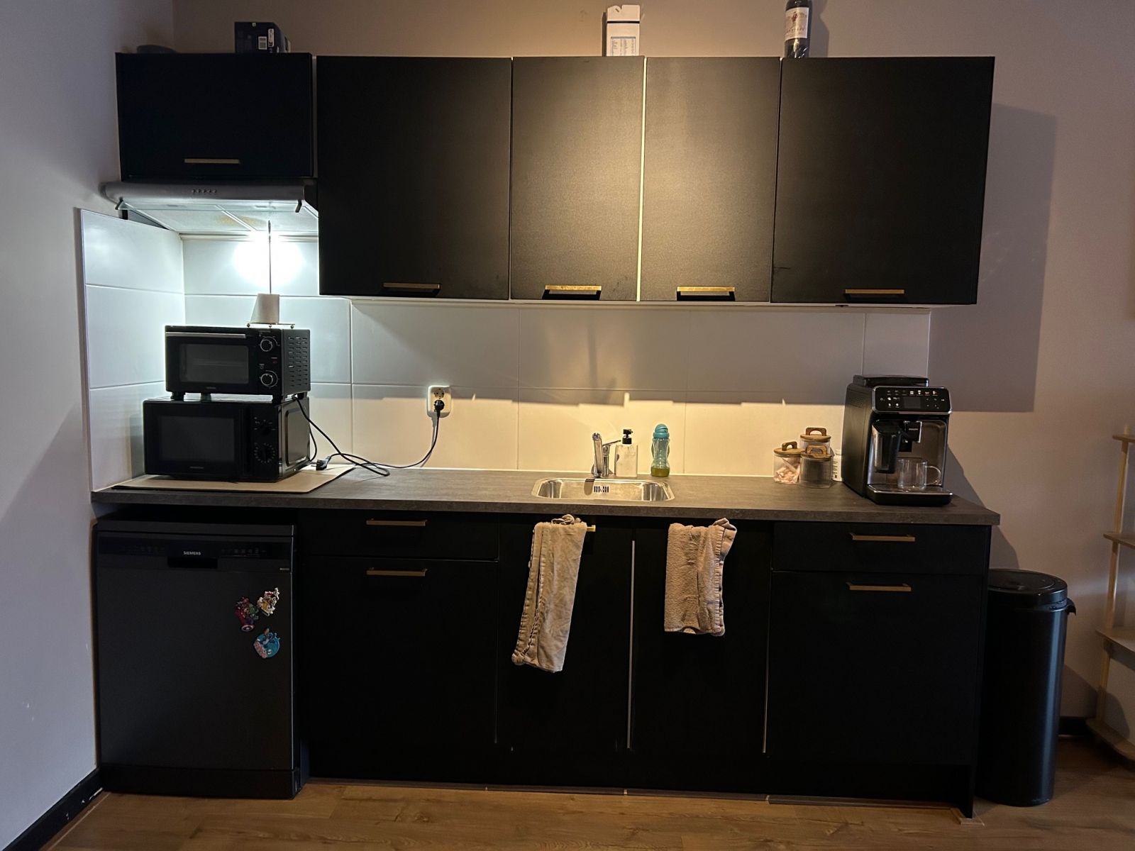 De keuken in de woning is gewrapped door de huidige bewoners. Dit kan worden overgenomen. De originele keuken heeft witte kasten.