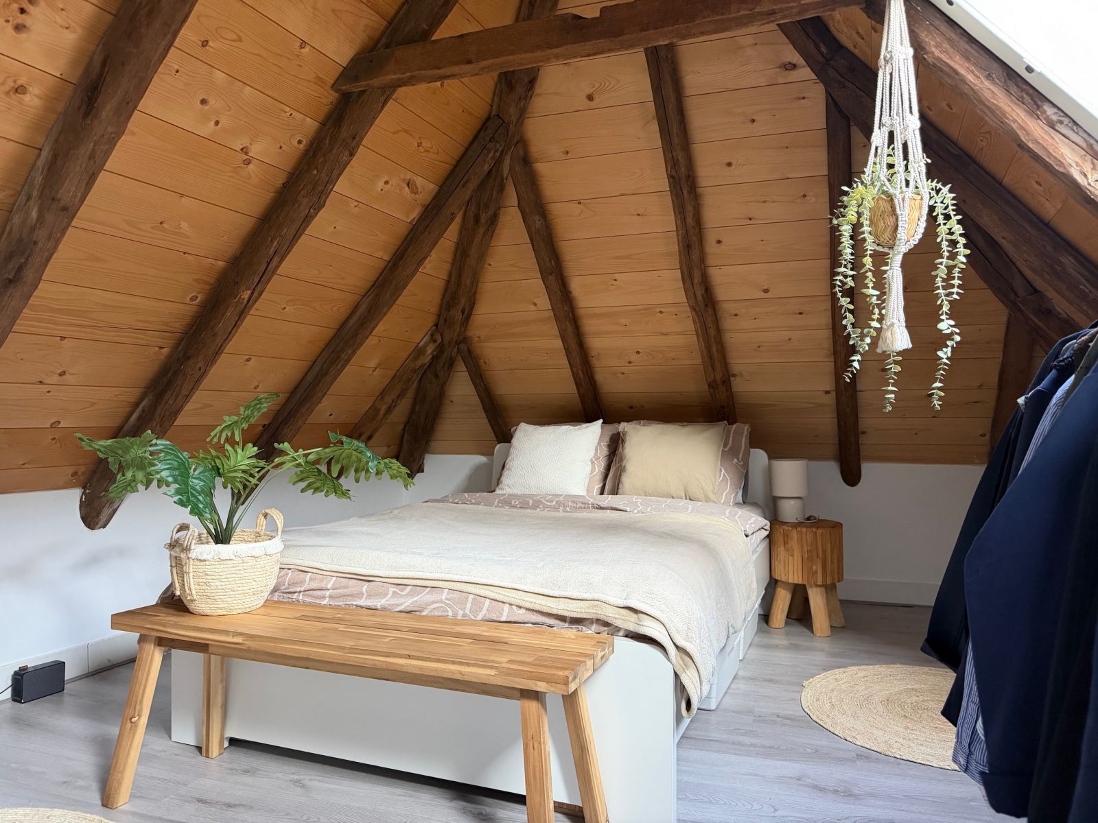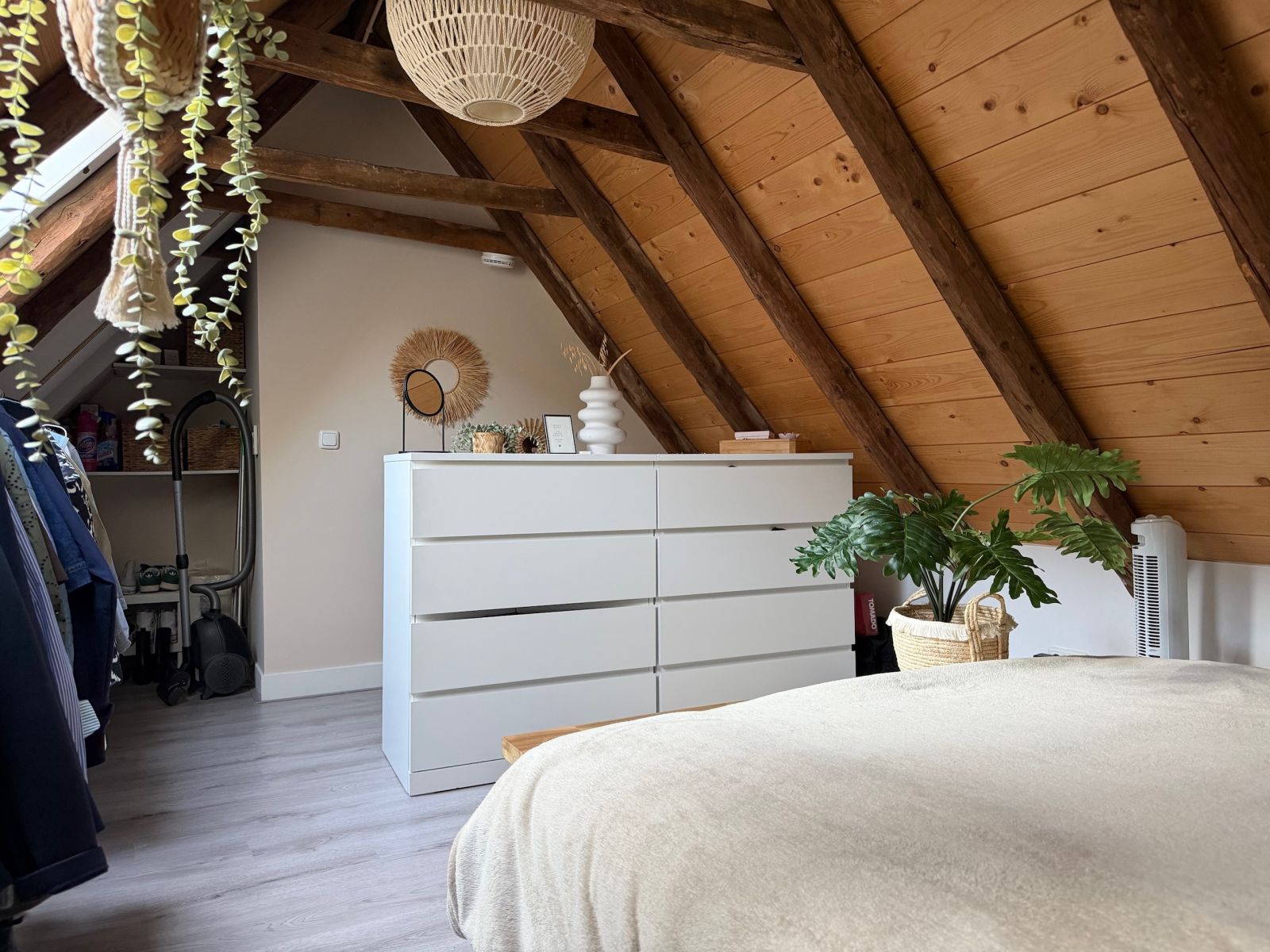 De keuken is uitgerust met een kookplaat, afzuigkap en een koel-vriescombinatie. Via de trap betreed je de slaapkamer.