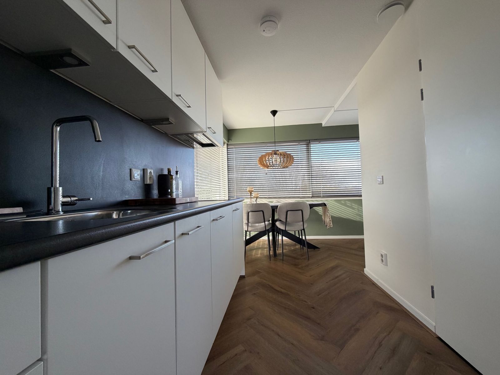 Bij binnenkomst stap je direct de keuken binnen, waar voldoende ruimte is voor het plaatsen van een eettafel. De keuken is voorzien van hedendaagse gemakken, zoals een inductiekookplaat, koelkast en afzuigkap. Tegenover de keuken bevindt zich de badkamer en in het verlengde van de keuken bereik je de woonkamer. Vanuit de woonkamer heb je toegang tot het balkon, wat zorgt voor een prettige buitenruimte. Daarnaast is er een praktische bergingskast aanwezig met aansluiting voor een wasmachine.